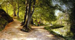 De fleste, og det vil jo nu sige byboer, forbinder i dag skoven med søndagsskovturenes oplevelser. Motivet øverst af Peder Mørk Mønsted (1888) viser et lille selskab midt i bøgeskoven med en rød paraply.